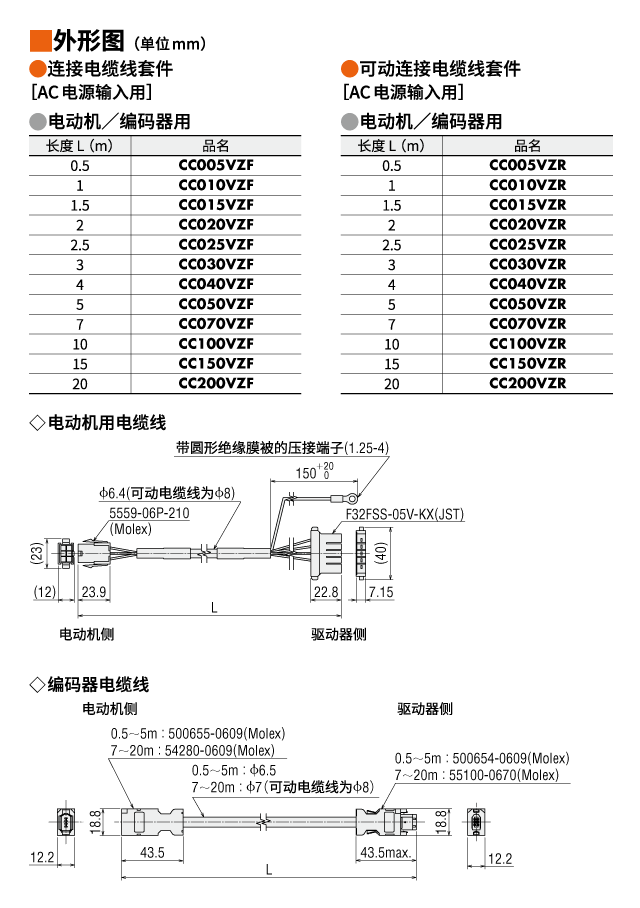 电动机用电缆线、编码器用电缆线、电磁制动用电缆线(带电磁制动电动机用)的套件。