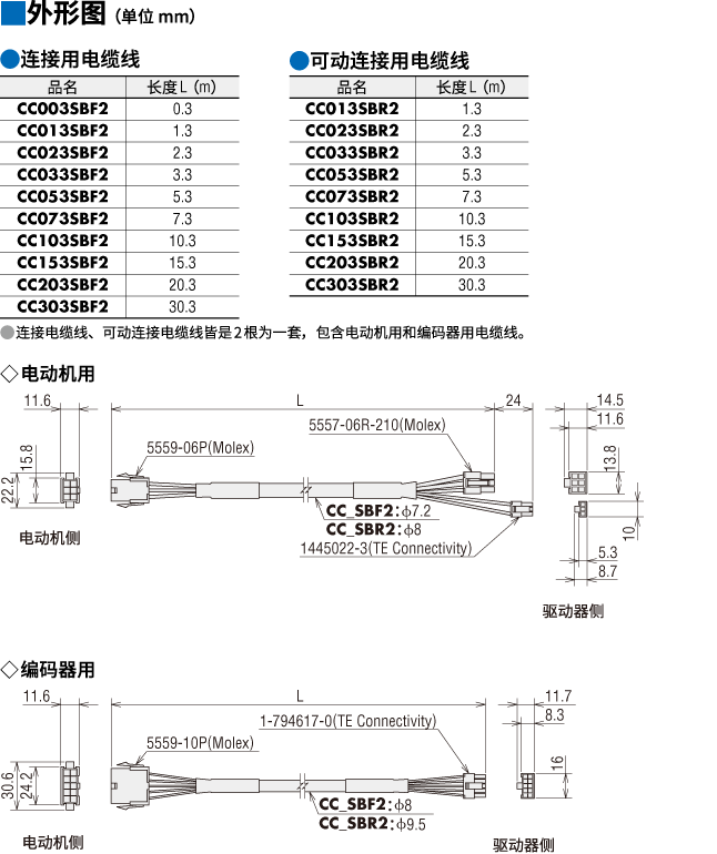请将电缆线全长控制在30.7米以内(不包括电动机电缆线,总共不超过3根)。电动机用电缆线和编码器用电缆线是成套的。